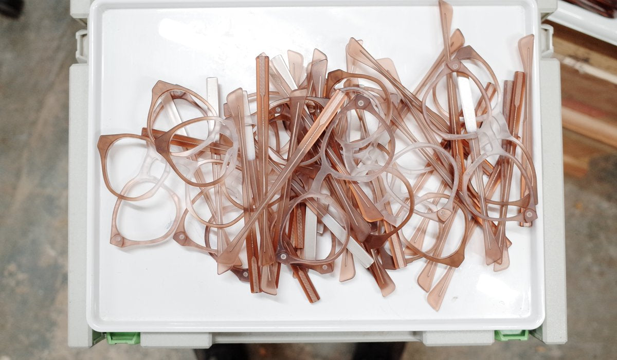 Frames are handmade from the highest quality NOS Italian cellulose acetate, built around precision German and Italian hardware, and come stock fitted with Zeiss CR-39 lenses. Materials are processed using a combination of traditional and contemporary manufacturing processes and mechanical finishing techniques. All design and production occurs in a small workshop in Massachusetts, USA.